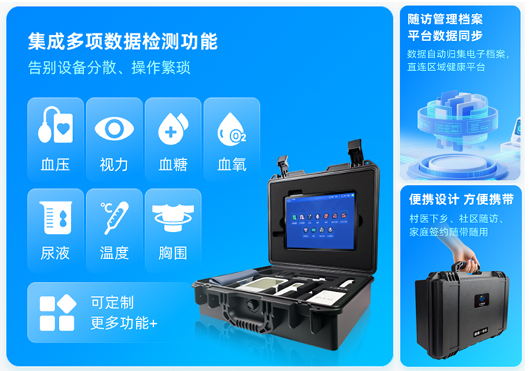 SH-203便攜式健康體檢一體機是上禾針對基層公衛推出的一款便攜式公共衛生檢測設備,可以通過平板電腦等數據采集終端和數據管理軟件系統實現一體化整合,實現血壓、心率、血氧、體溫、心電、血糖、尿酸、血紅蛋白、血脂四項、尿常規等多種參數檢測,快速建立居民電子健康檔案,與信息管理平臺或健康檔案管理系統進行數據交互傳輸,可上傳或成批次/單獨下載調用數據,并提供接口開發包,支持將采集到的健康數據上傳至區域信息平臺或健康檔案管理系統。支持隨訪管理以及AI報告分析,支持PDF報告上傳。